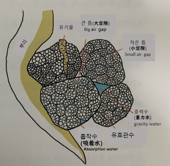 농사짓기에 좋은 땅은 물 빠짐이 좋아야 하고, 흙 속의 빈 틈 사이로 물이 잘 빠져야 공기가 잘 통할 수 있다. 즉 배수성(排水性, drainability)과 통기성(通氣性, air permeability)은 같은 말이다. 양분은 물을 따라 이동하고, 큰 틈(공극)으로는 물이 빠지지만 작은 틈(공극)으로는 물을 지닌다. 이것을 모세관 효과라고 한다.